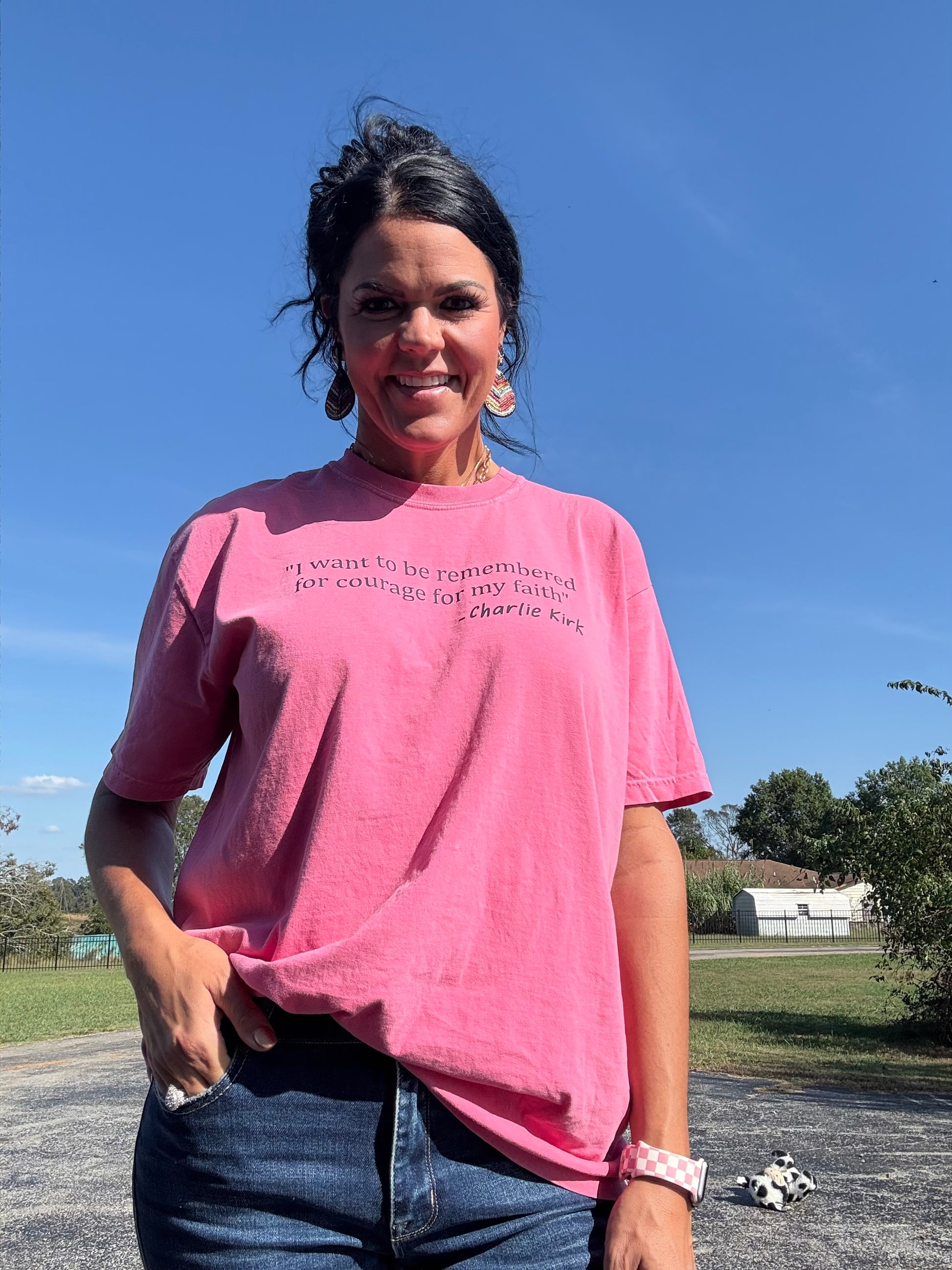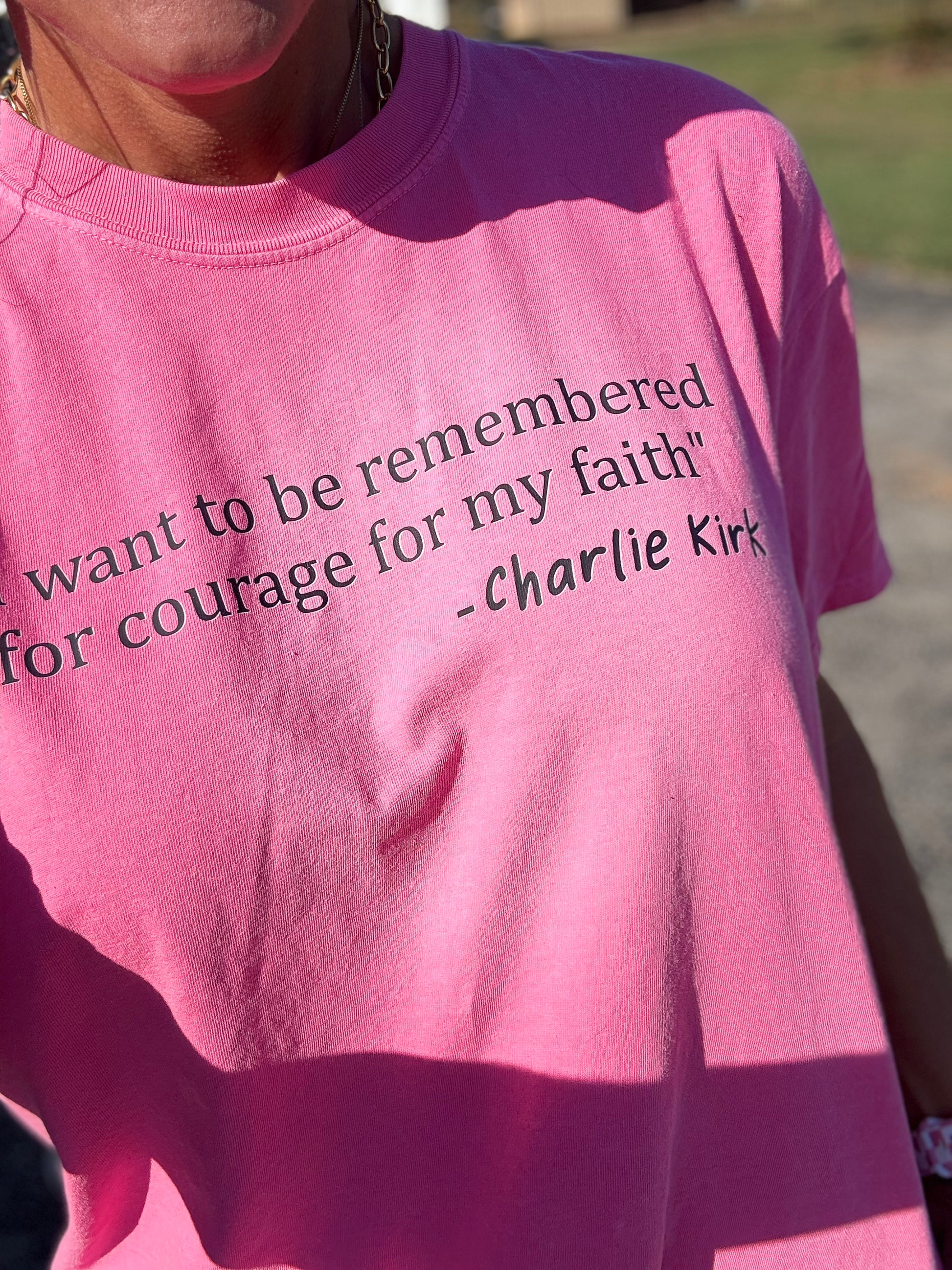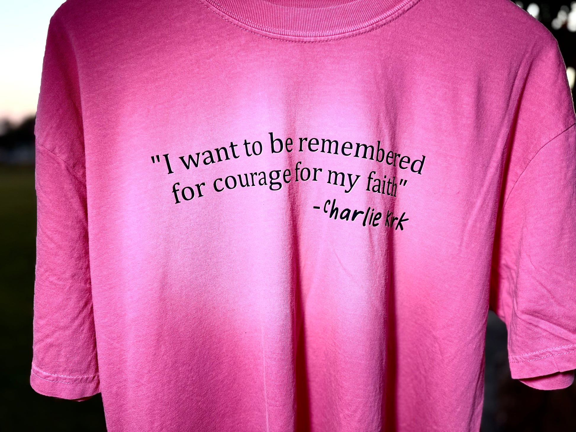 Celebrate boldness and belief with this vibrant pink Comfort Colors tee honoring Charlie Kirk. Featuring his memorable quote, "I want to be remembered for courage for my faith," this shirt is perfect for those who embrace bravery and faith with a playful spirit. Available in sizes small to 3XL, it offers a comfy fit that stands out in any crowd. Show your love and remembrance with a tee as lively as your convictions.