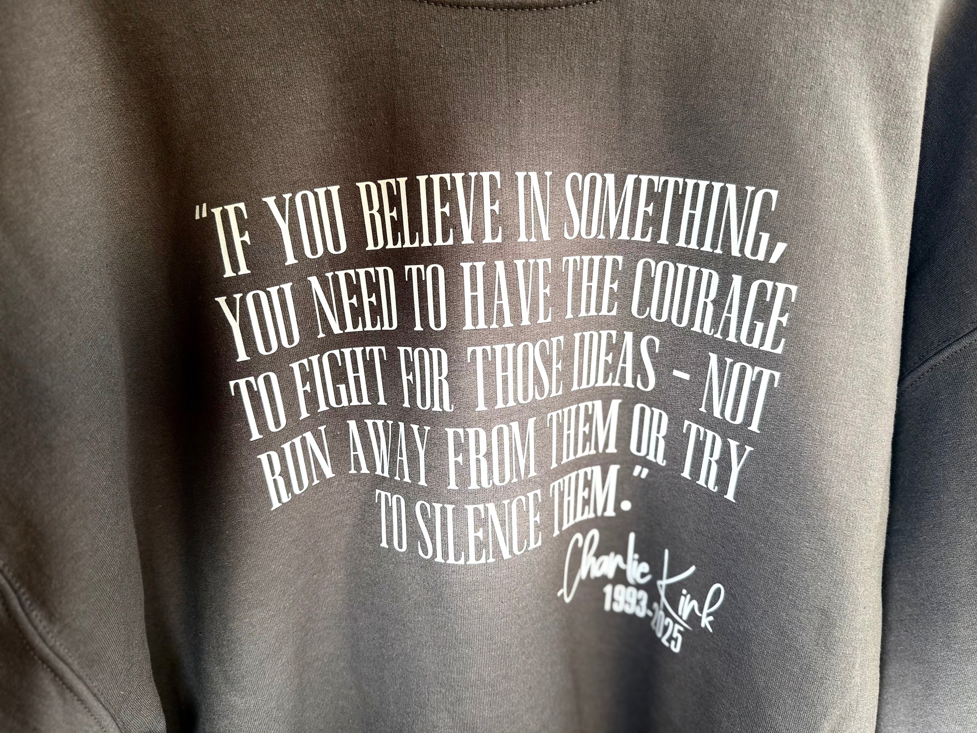 Show your fearless side with the Courage To Fight Sweatshirt from Kodee Lissa Boutique. Made on a comfy Gildan sweatshirt and available in sizes Small to 3XL, it features a bold quote by Charlie Kirk: "If you believe in something, you need to have the courage to fight for those ideas—not run away from them or try to silence them." Printed in crisp white on soft grey, this sweatshirt is perfect for standing out while staying cozy. We love you, Charlie!