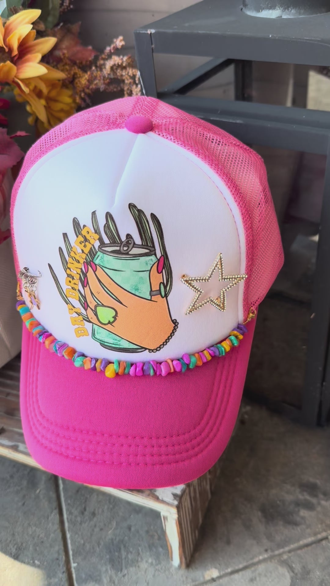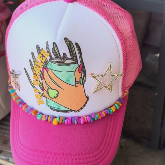 Make a statement with the Day Drinker Trucker Hat by Kodee Lissa Boutique. Featuring a bold pink foam brim and a fun middle print of a hand holding an ice-cold drink with "Day Drinker" and a cactus, this hat turns heads effortlessly. The multicolored hat band with charming accents and a shiny gold star pin add the perfect playful touch to brighten your day.