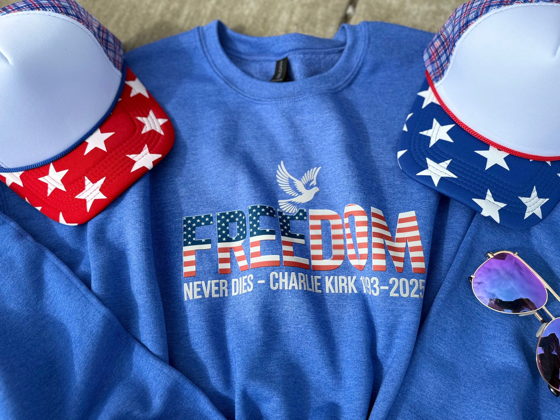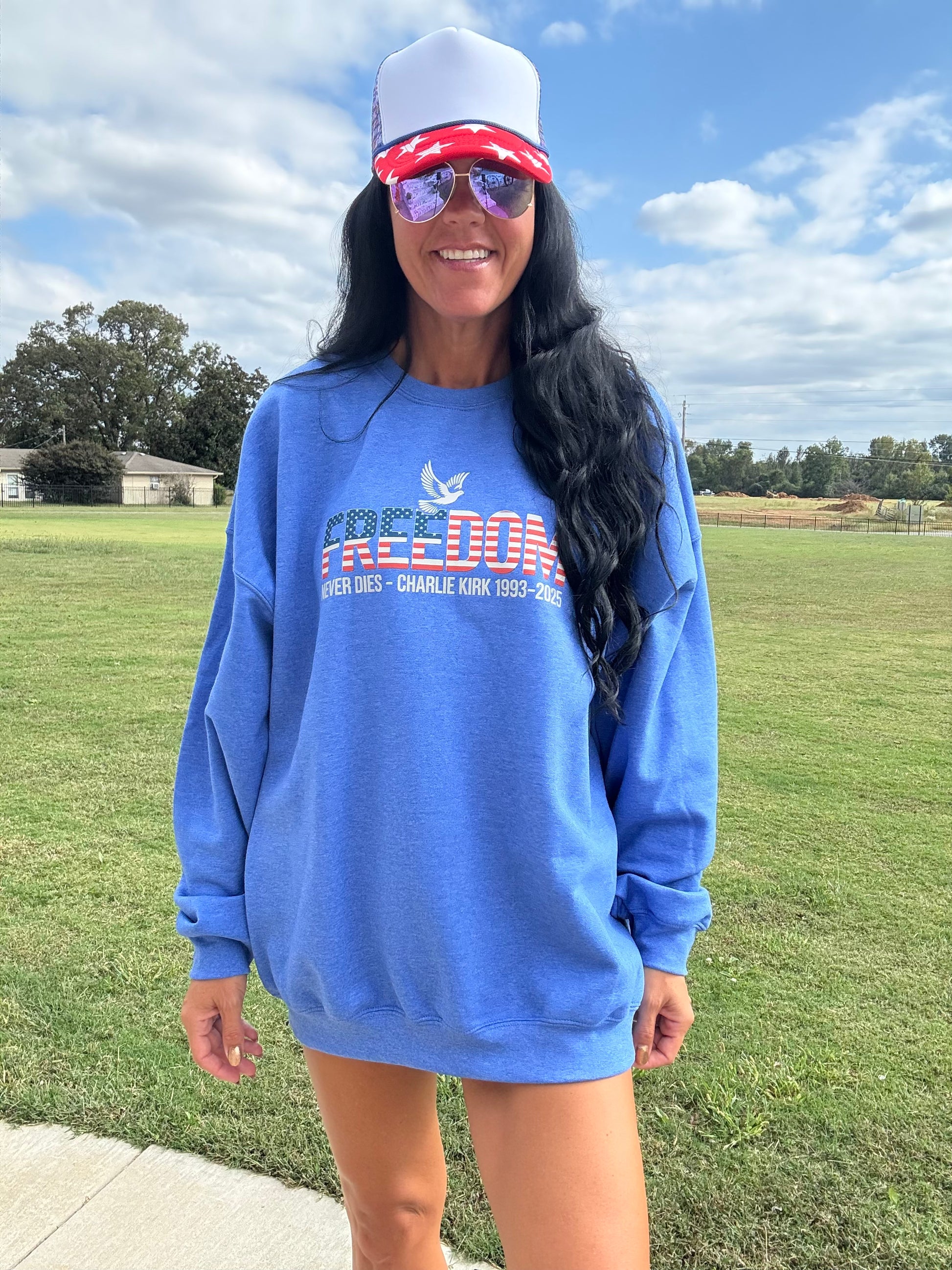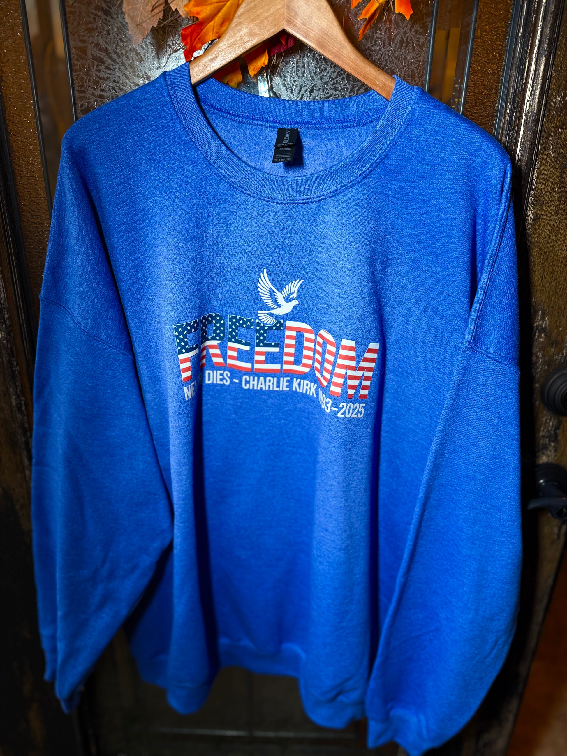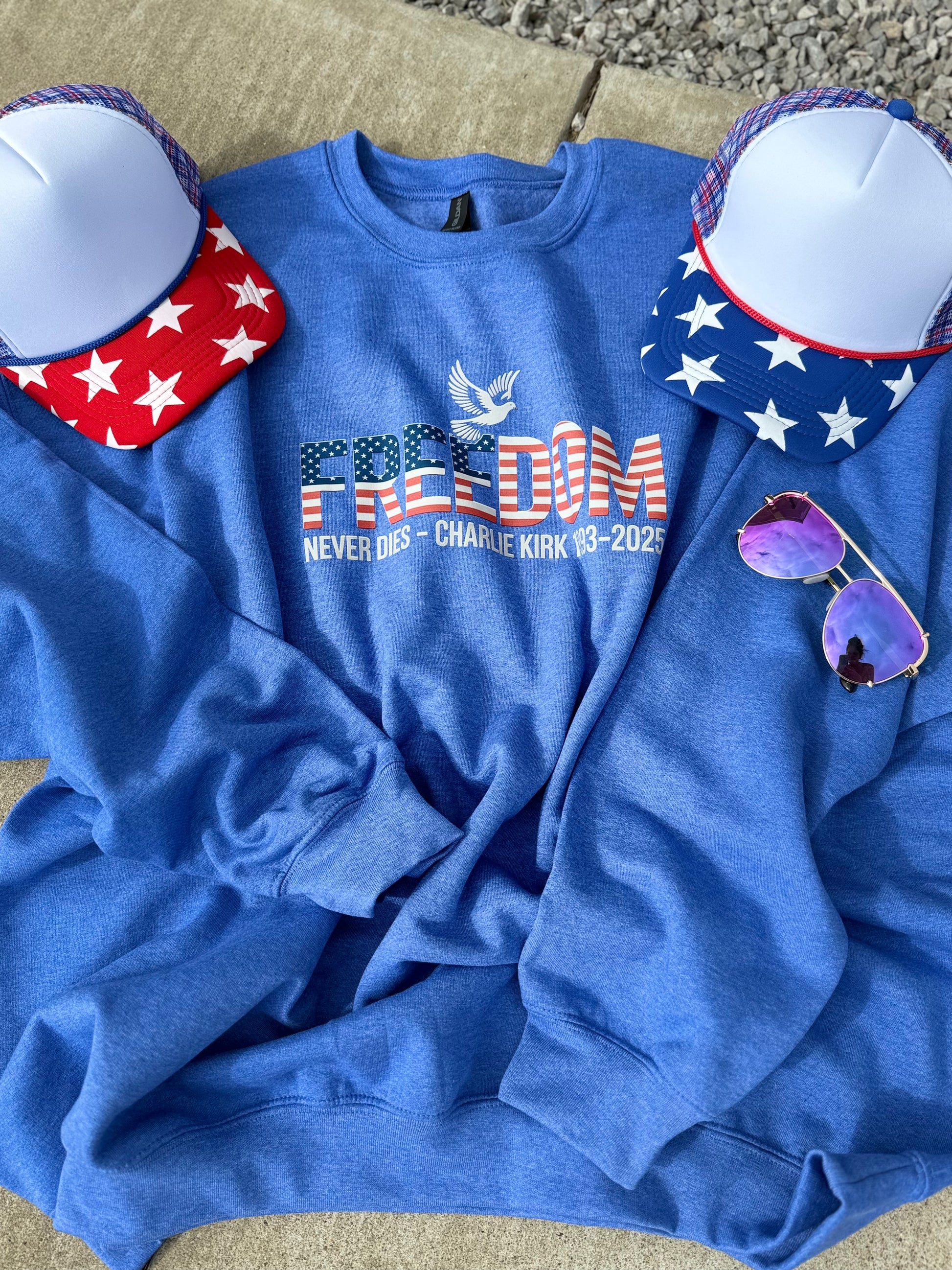 Celebrate your patriotic spirit with the "Freedom Never Dies" sweatshirt! This vibrant red, white, and blue design features a white dove in memory of Charlie Kirk, symbolizing peace and remembrance. Made from soft Gildan fabric and available in sizes small to 3XL, it’s a cozy way to show your love for freedom with a playful touch. Perfect for any casual occasion or patriotic event!