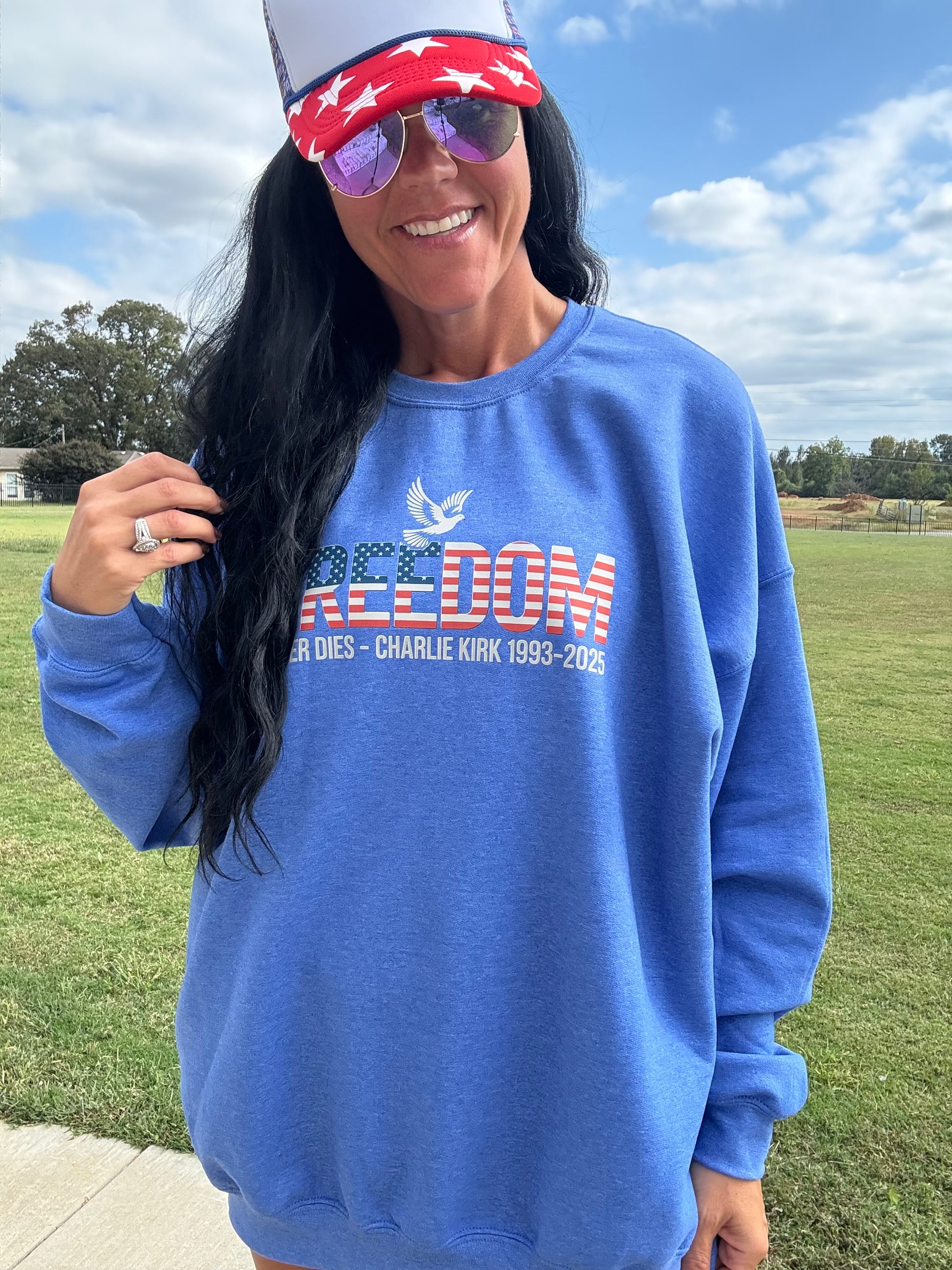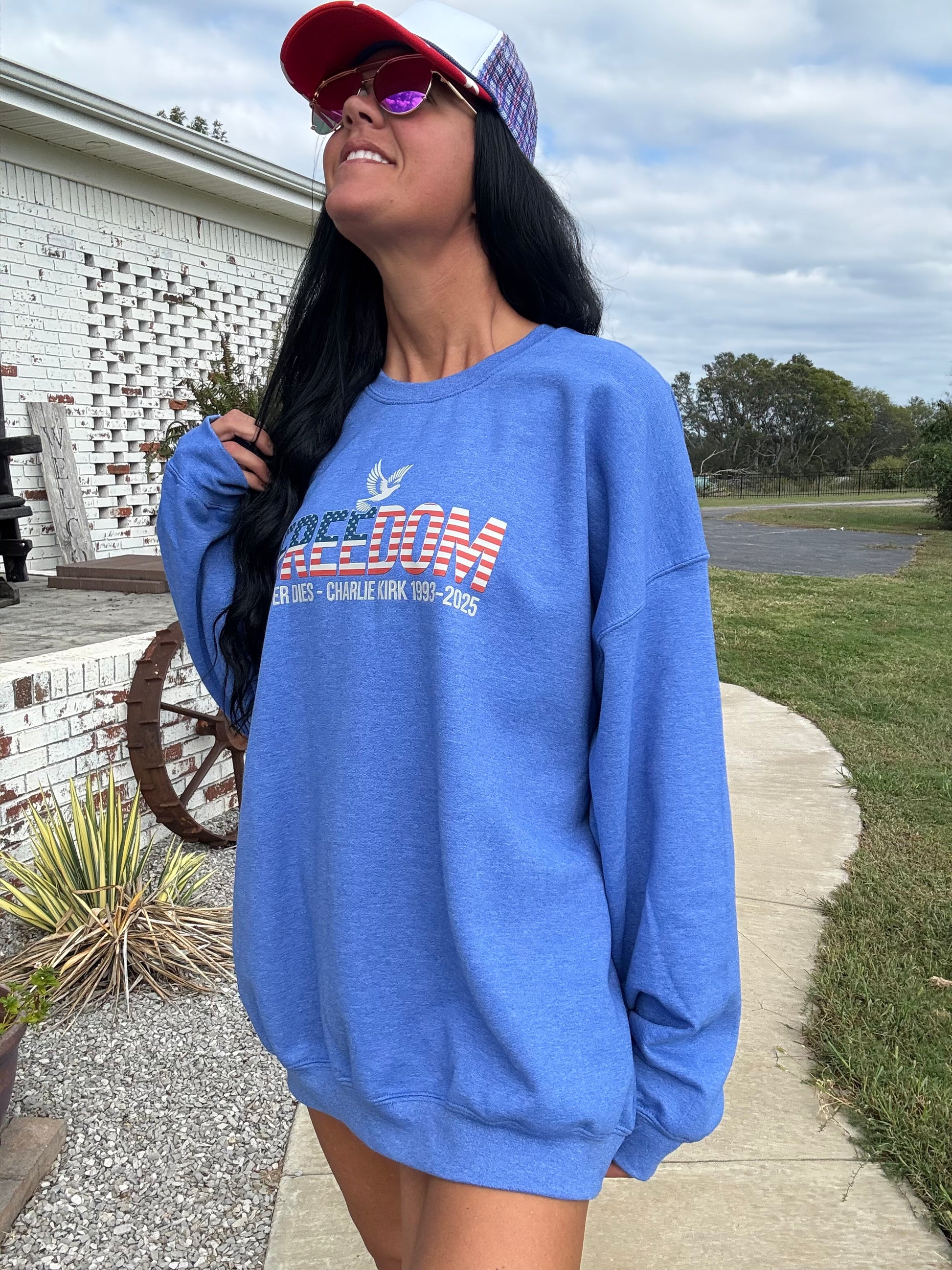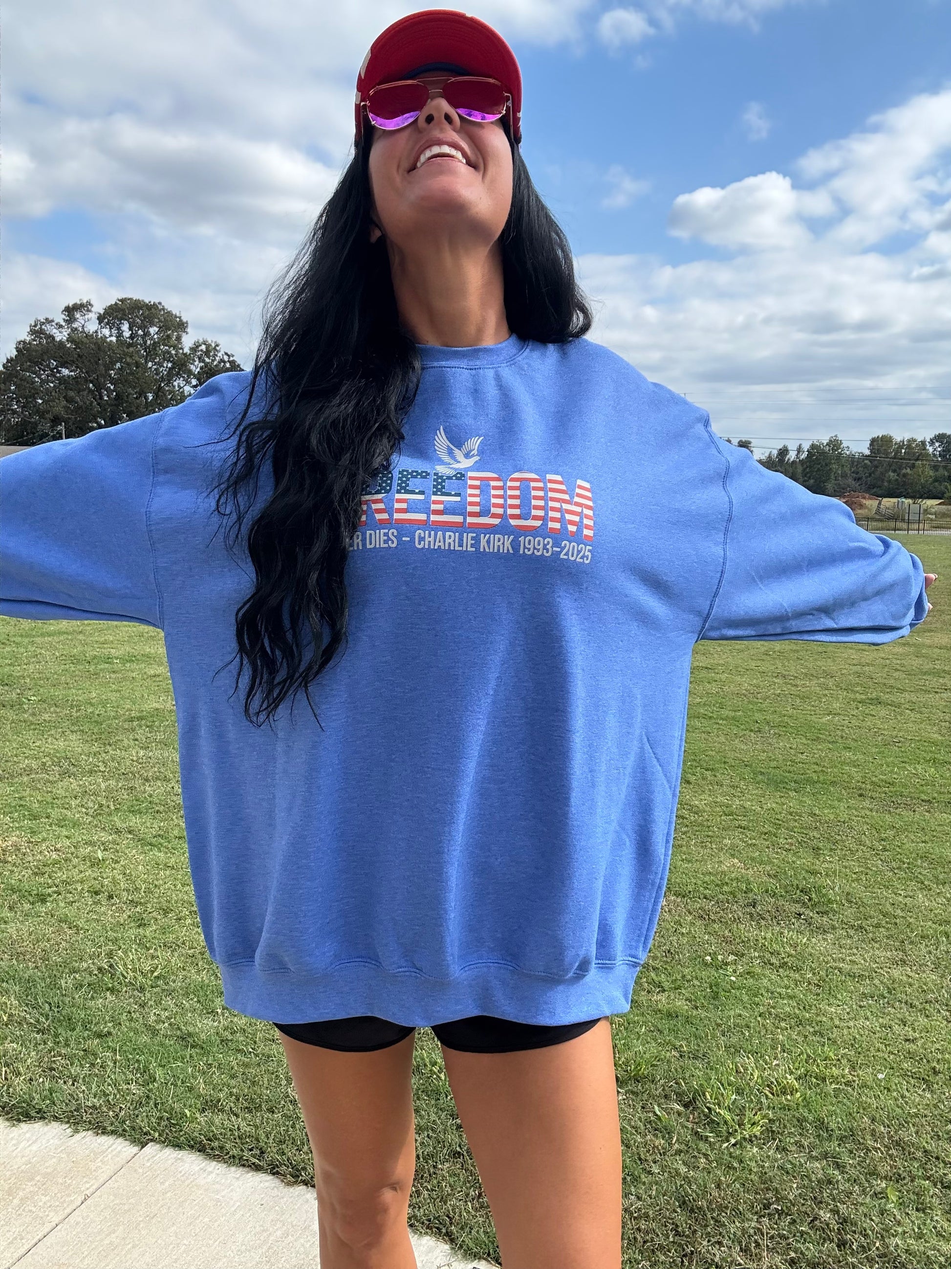 Celebrate your patriotic spirit with the "Freedom Never Dies" sweatshirt! This vibrant red, white, and blue design features a white dove in memory of Charlie Kirk, symbolizing peace and remembrance. Made from soft Gildan fabric and available in sizes small to 3XL, it’s a cozy way to show your love for freedom with a playful touch. Perfect for any casual occasion or patriotic event!
