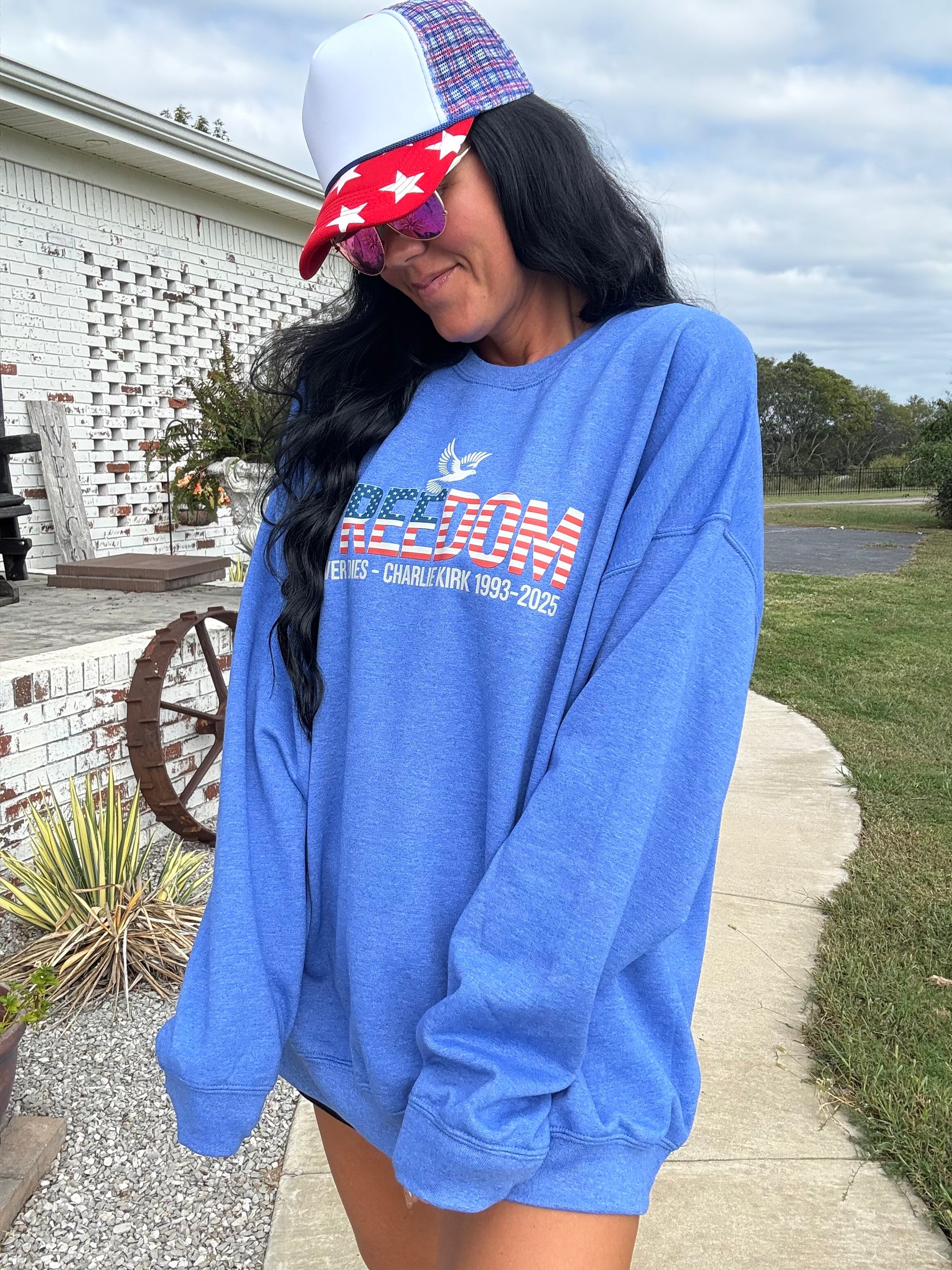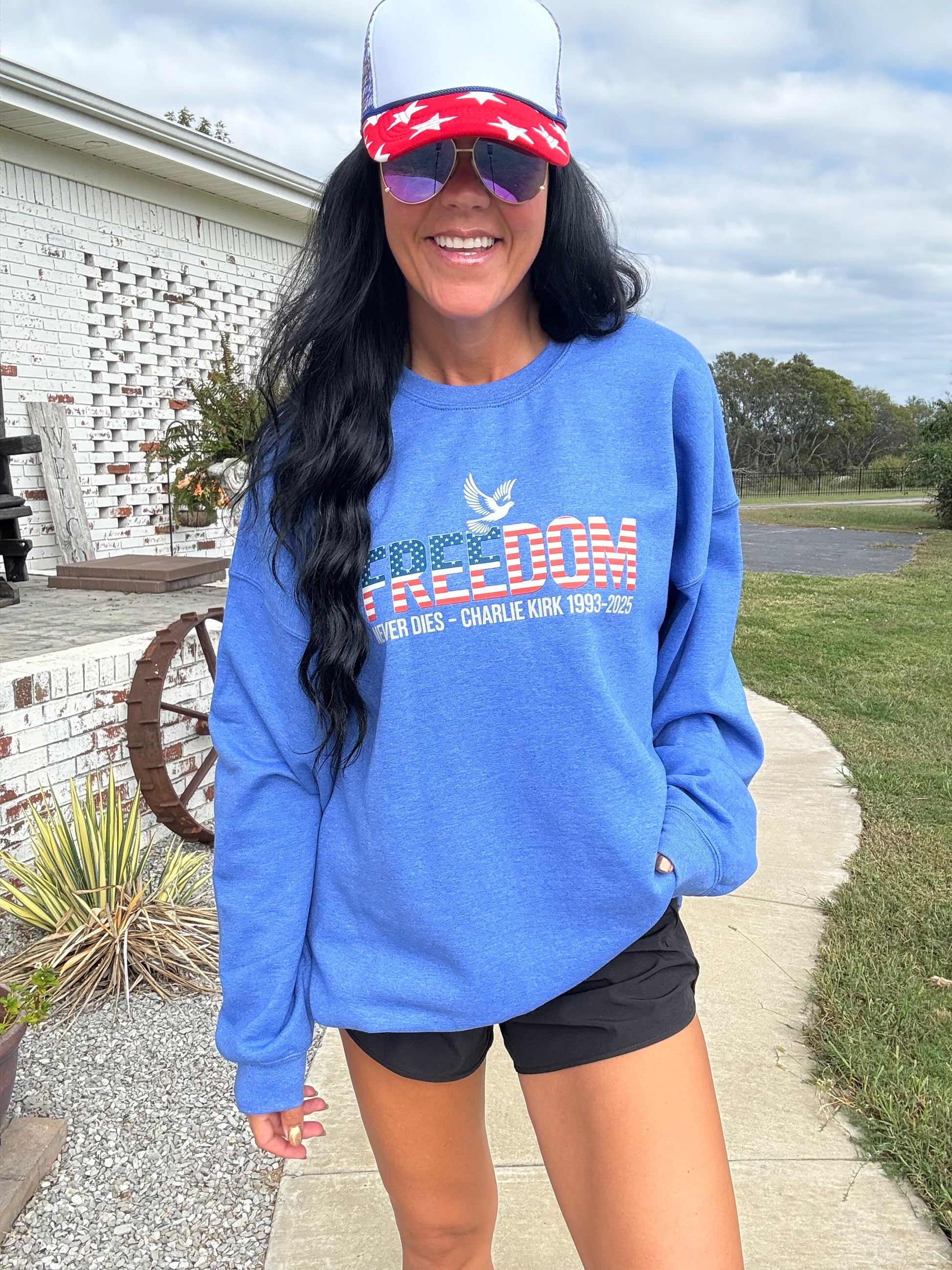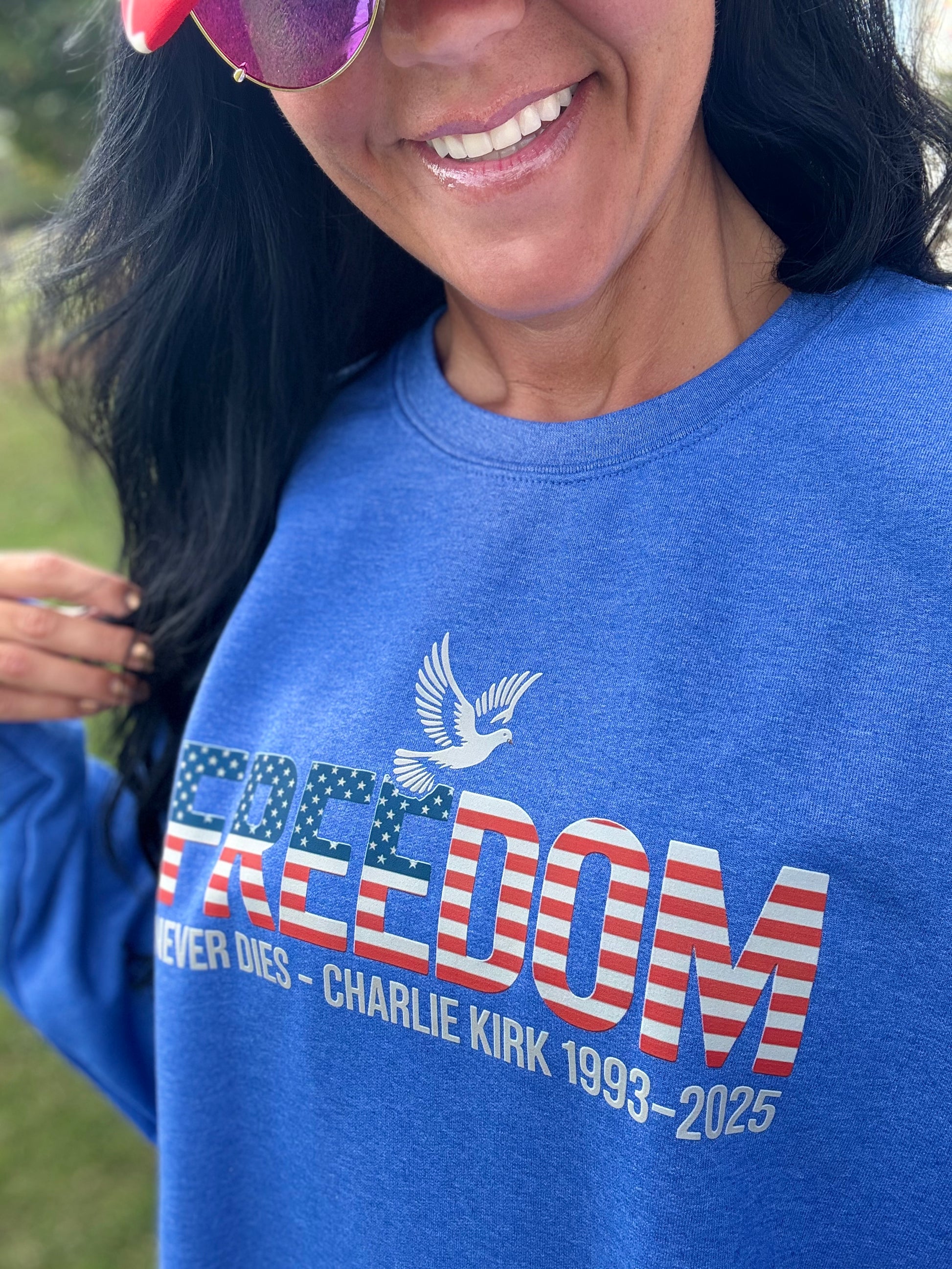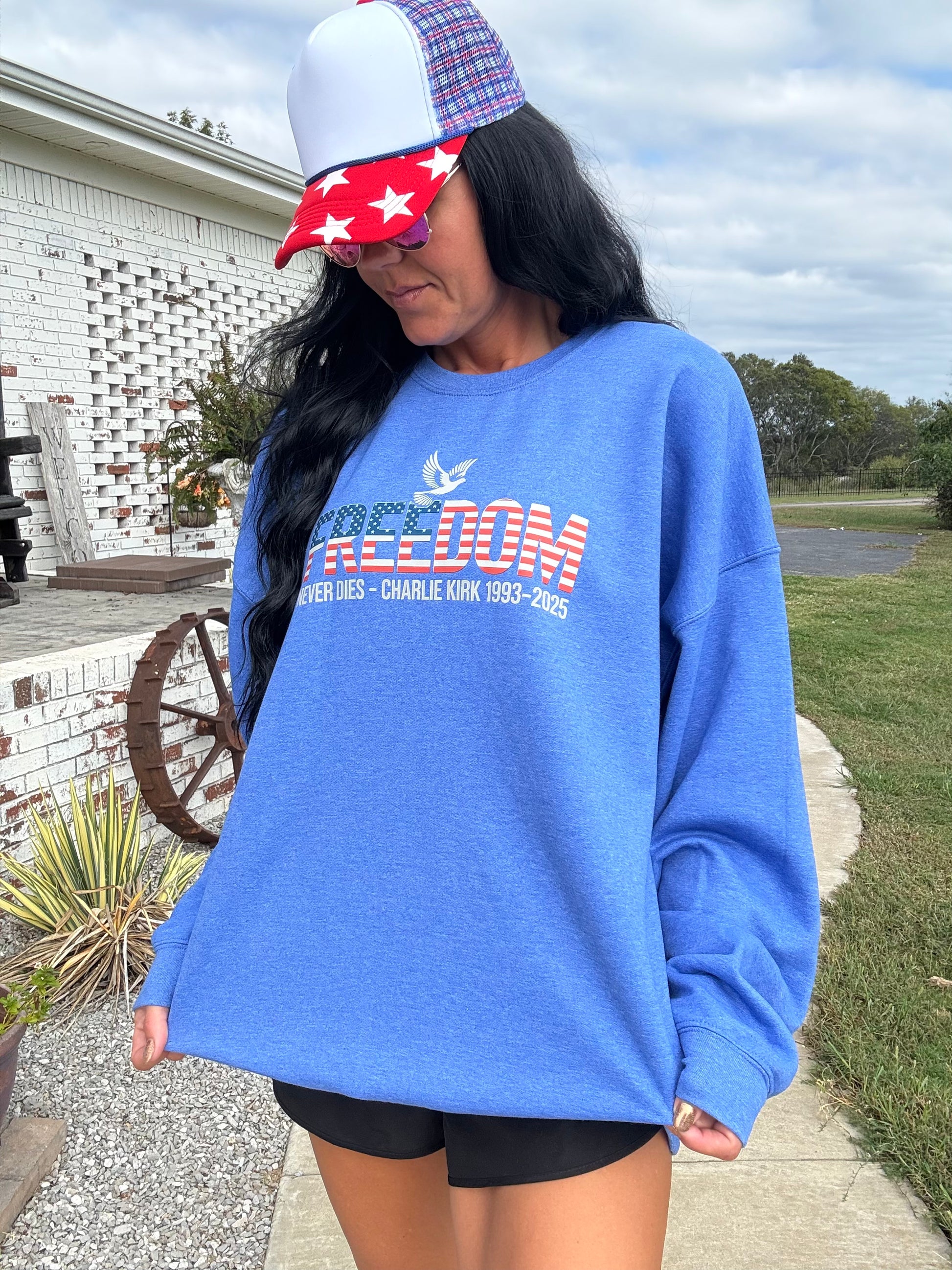 Celebrate your patriotic spirit with the "Freedom Never Dies" sweatshirt! This vibrant red, white, and blue design features a white dove in memory of Charlie Kirk, symbolizing peace and remembrance. Made from soft Gildan fabric and available in sizes small to 3XL, it’s a cozy way to show your love for freedom with a playful touch. Perfect for any casual occasion or patriotic event!