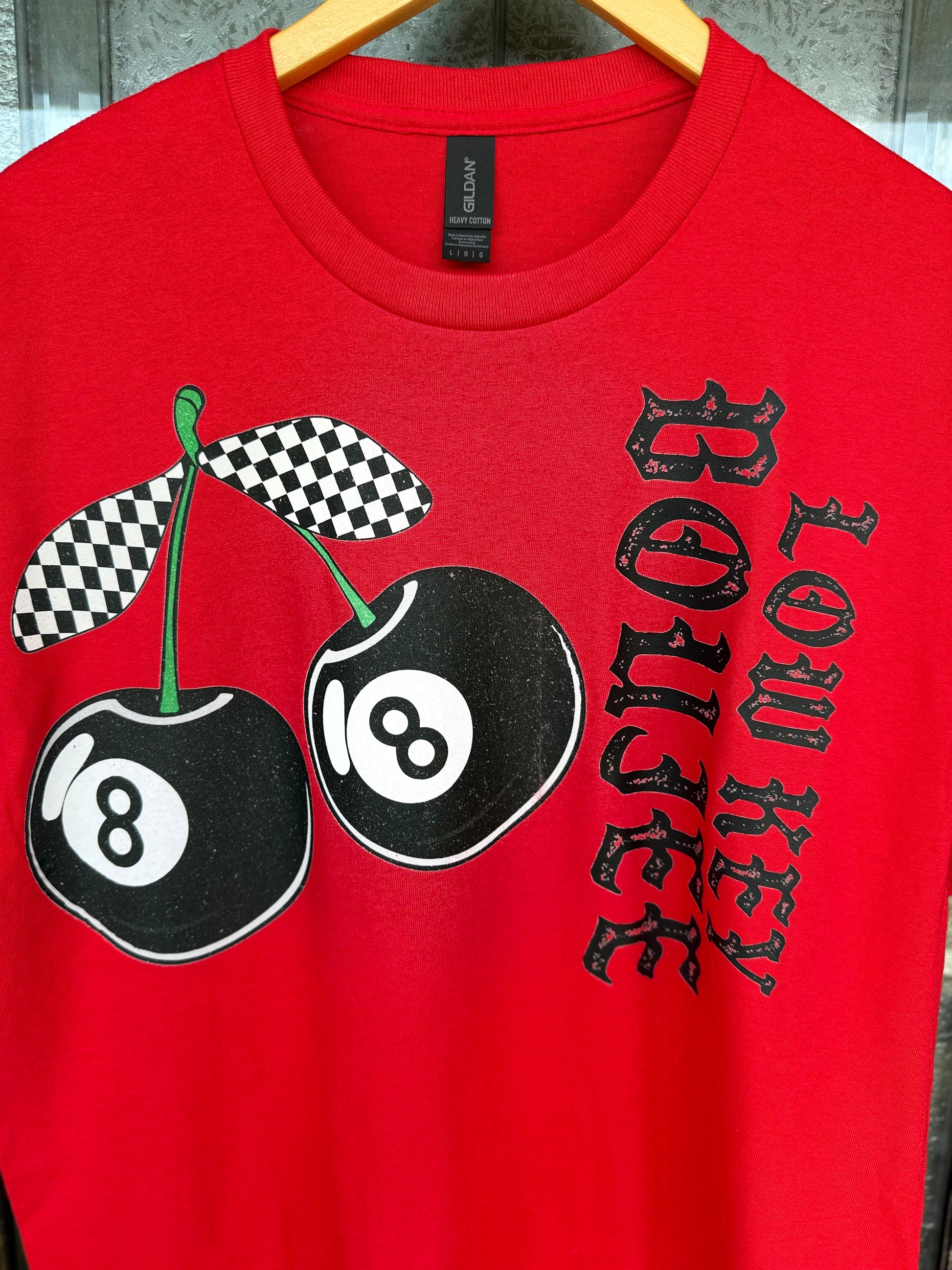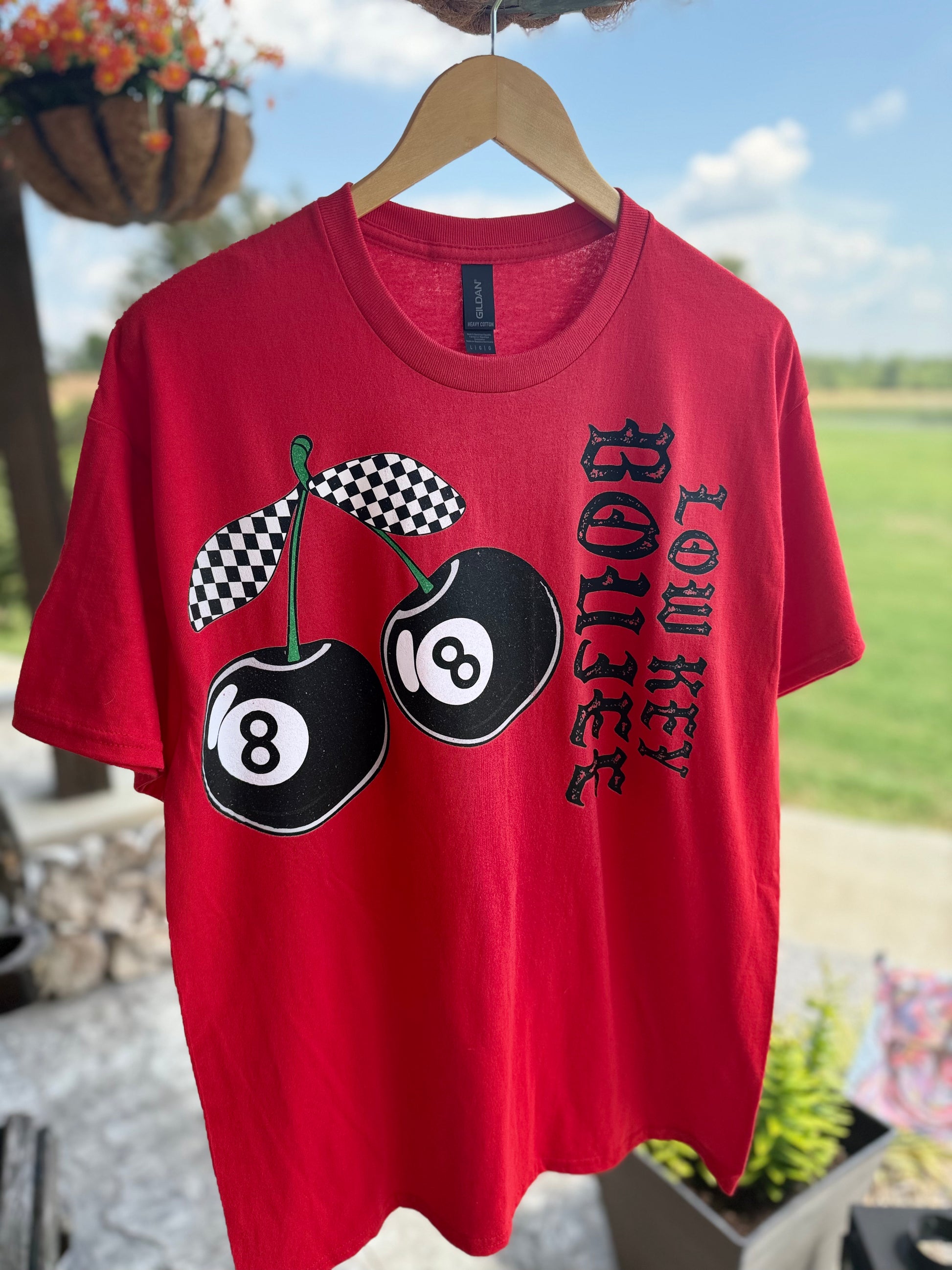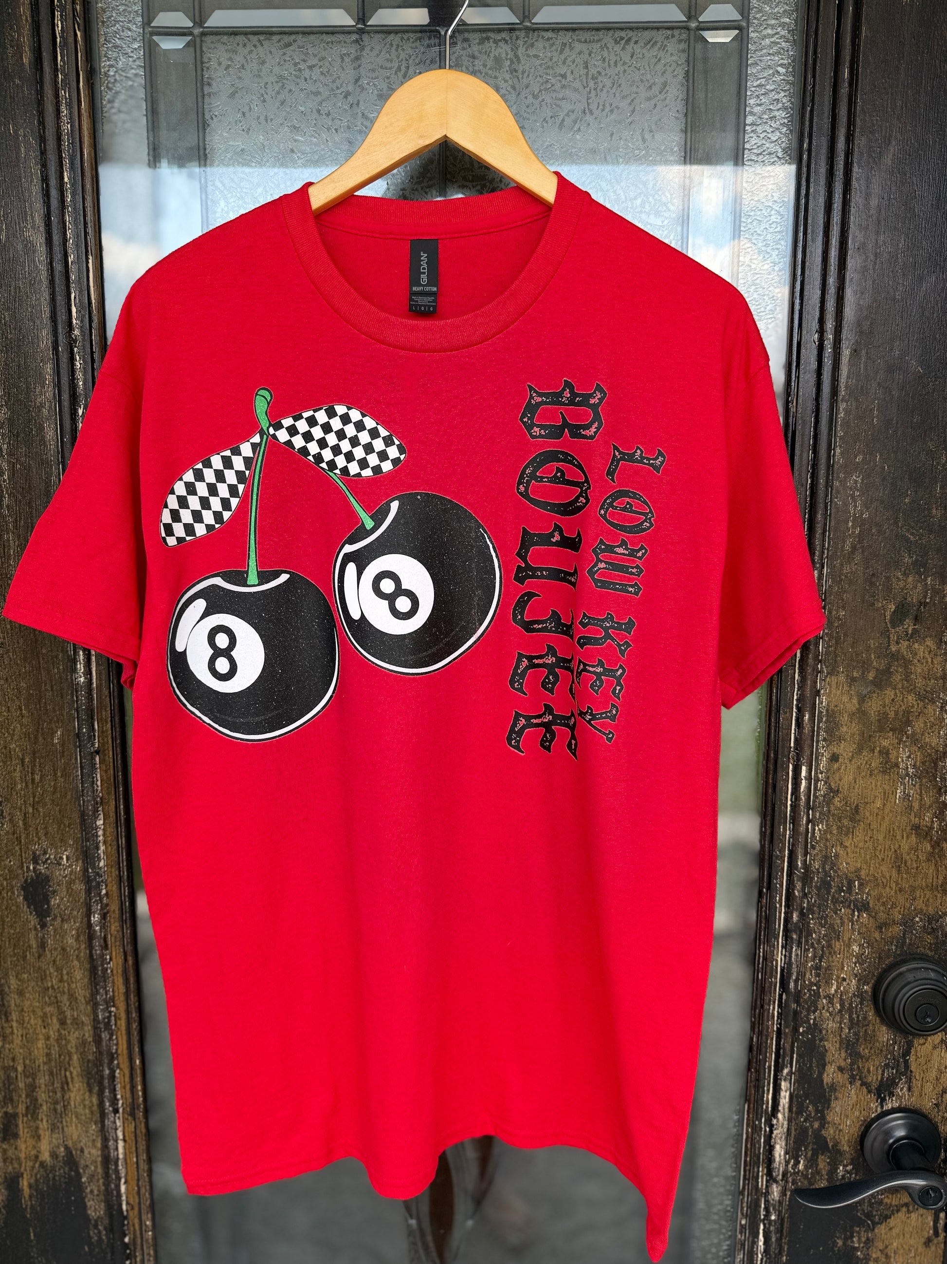 This Low Key Boujee T-shirt features a fun 8-ball cherries design that adds a unique twist to your casual look. Made from 100% cotton by Gildan, it offers comfort and durability. Available in size large, this versatile tee easily pairs with your favorite jeans or shorts for effortless style with a playful edge.
